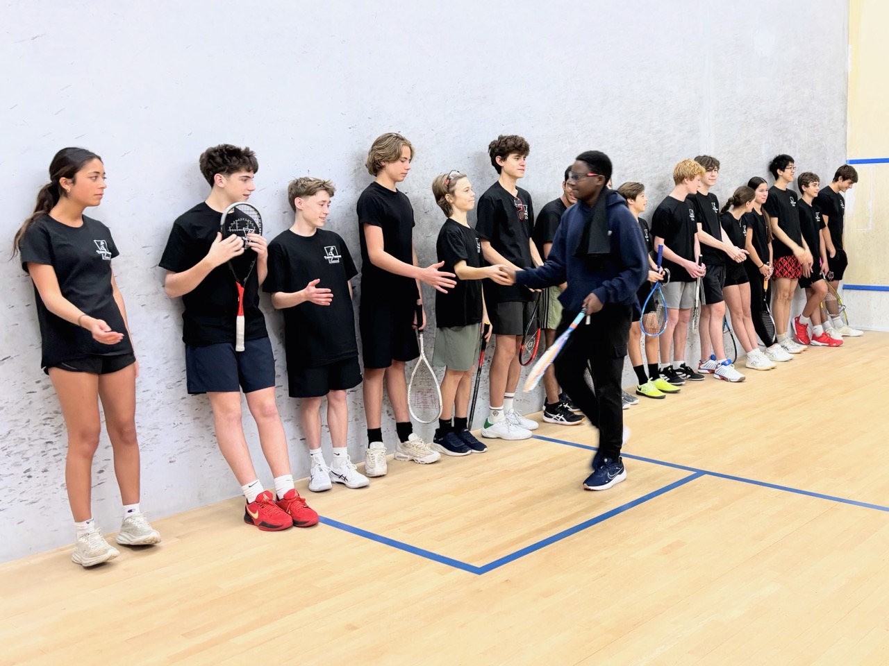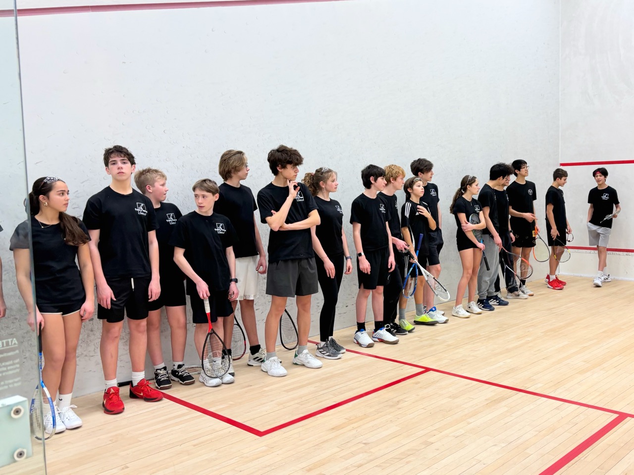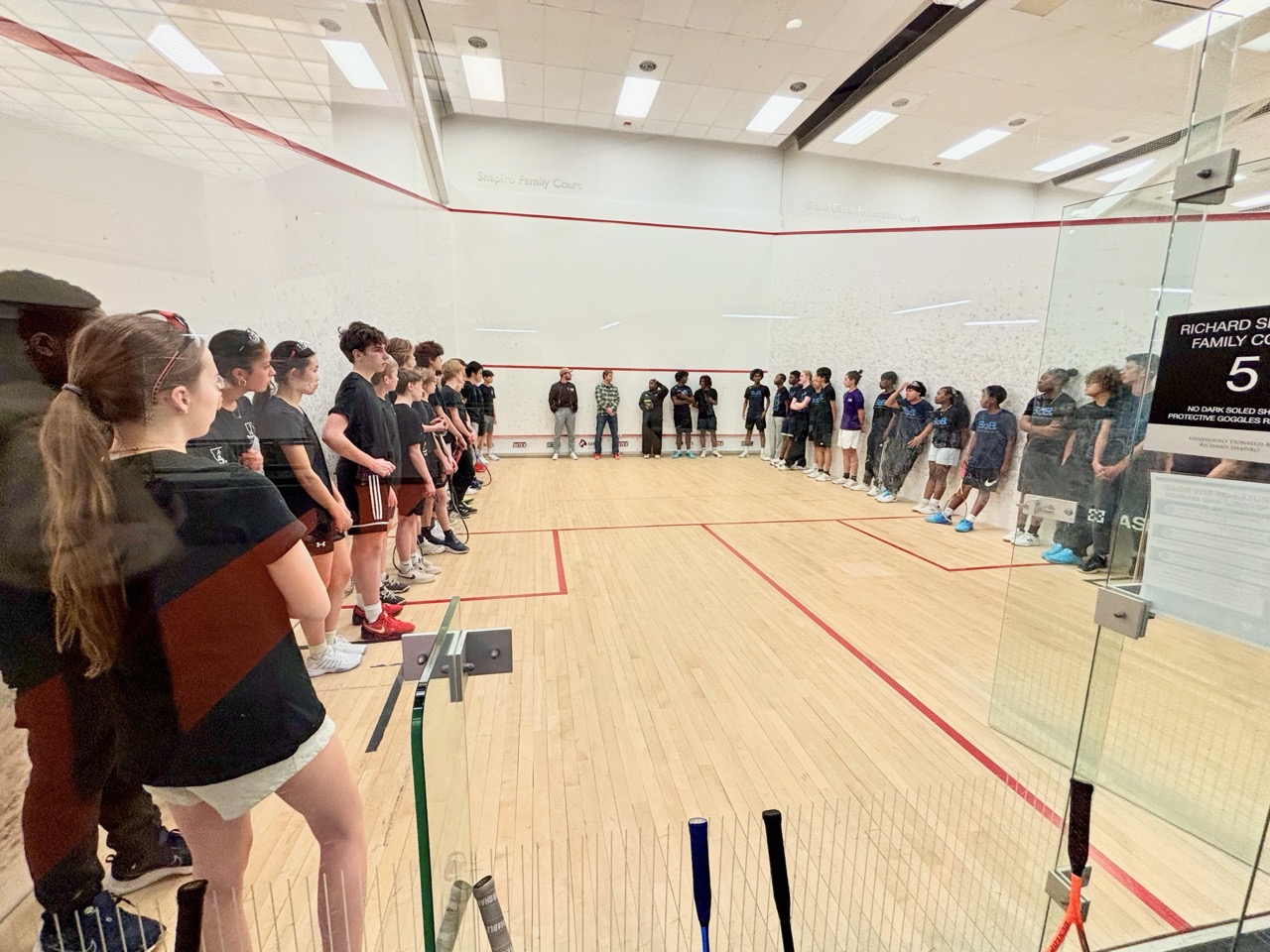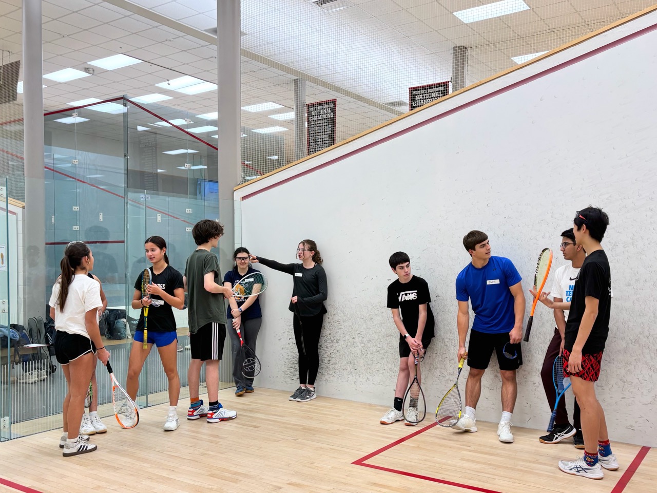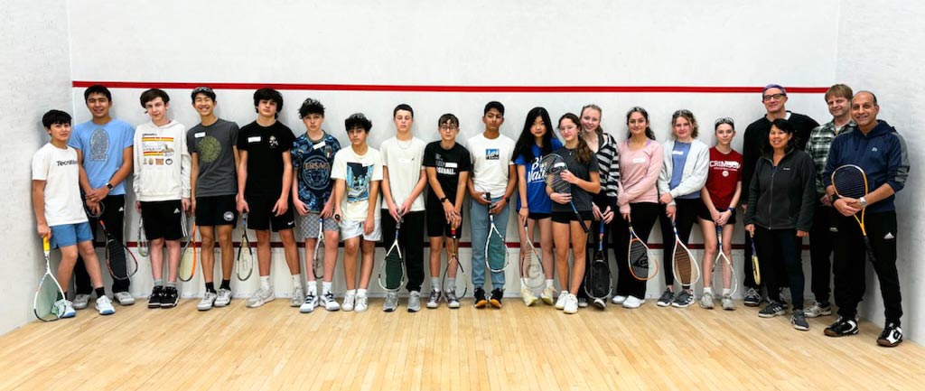 Players learned basic strokes and rules of the game. They started by playing games (to 11), and eventually matches (best of 5 games). They also learned how to referee and keep official scoresheets – extremely important as junior squash matches are all peer-reffed. This is one of the nicest parts of team and tournament play – after playing a match, the two competitors who just finished sit together to referee the next match on court – this forces competitors to acknowledge each other and to work together, helping to develop sportsmanship as well as friendships.