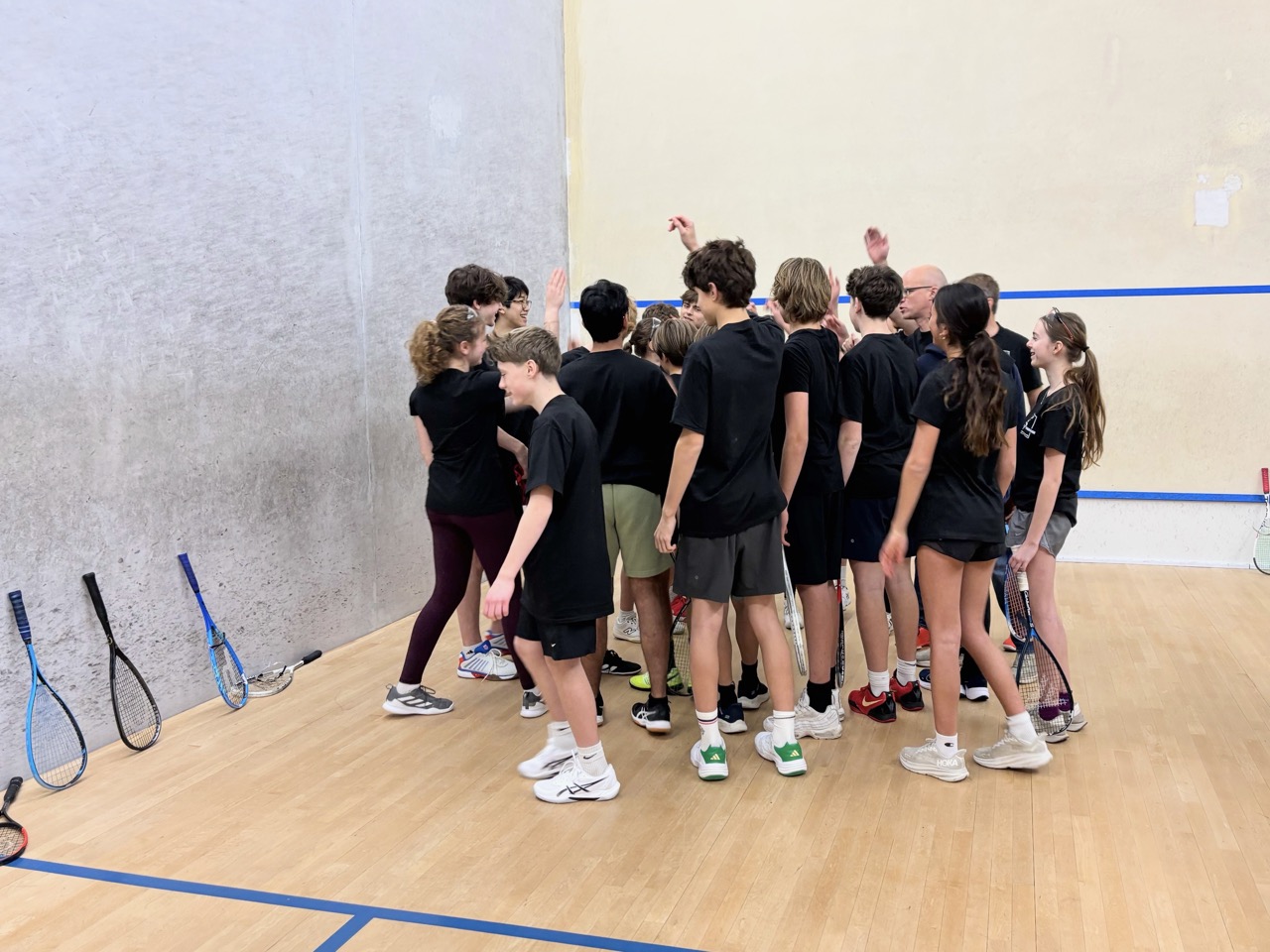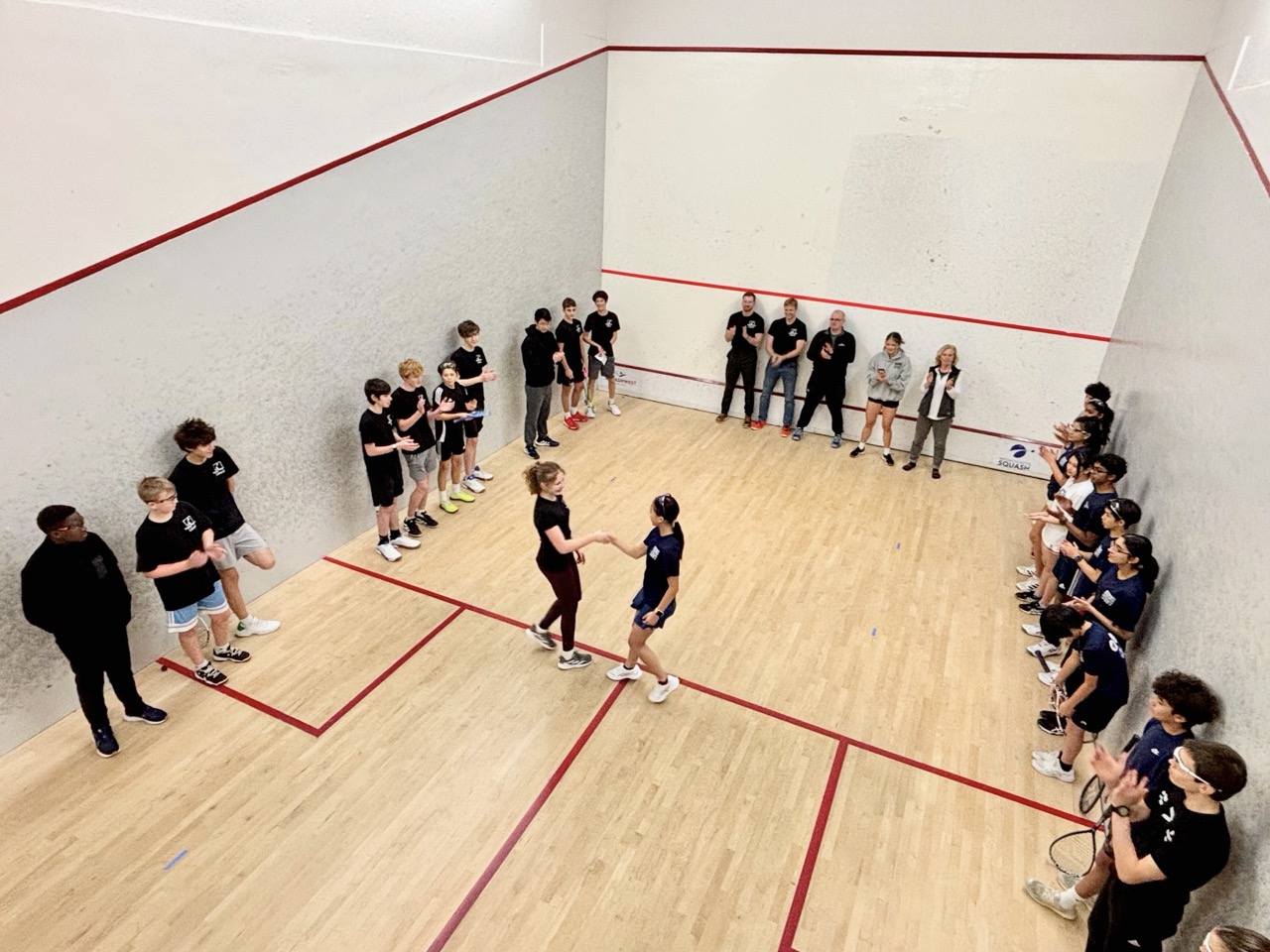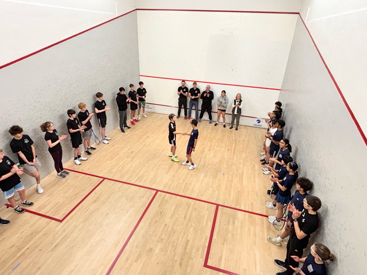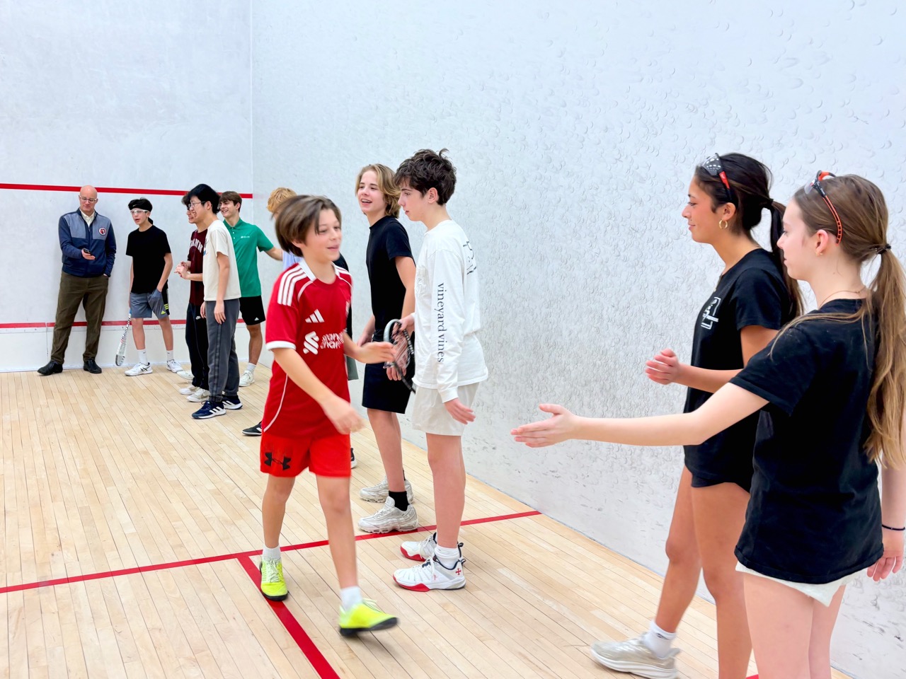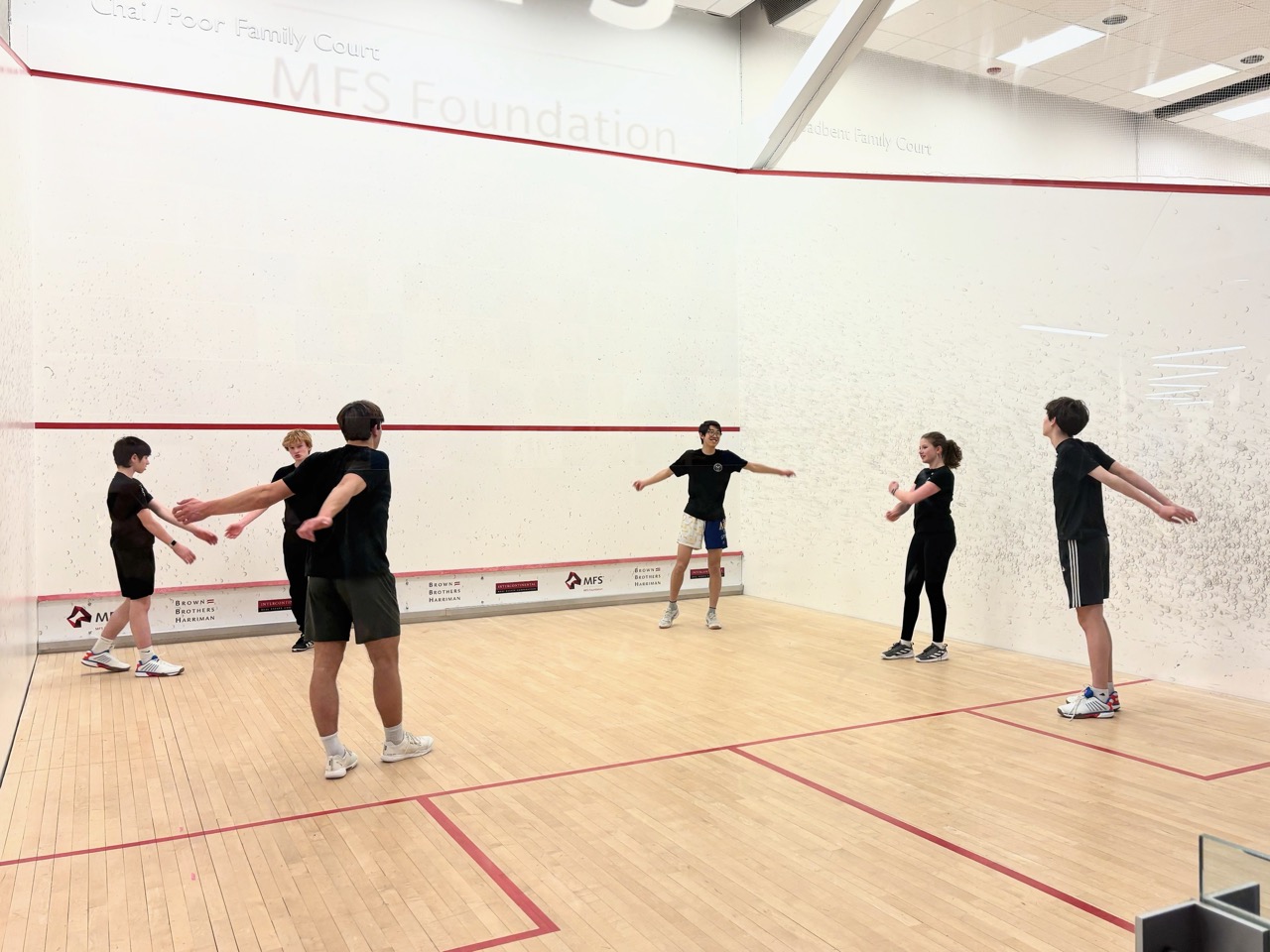 Players learned basic strokes and rules of the game. They started by playing games (to 11), and eventually matches (best of 5 games). They also learned how to referee and keep official scoresheets – extremely important as junior squash matches are all peer-reffed. This is one of the nicest parts of team and tournament play – after playing a match, the two competitors who just finished sit together to referee the next match on court – this forces competitors to acknowledge each other and to work together, helping to develop sportsmanship as well as friendships.