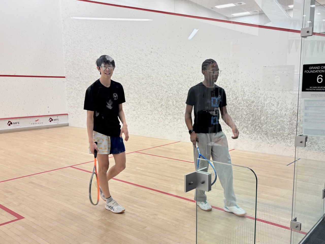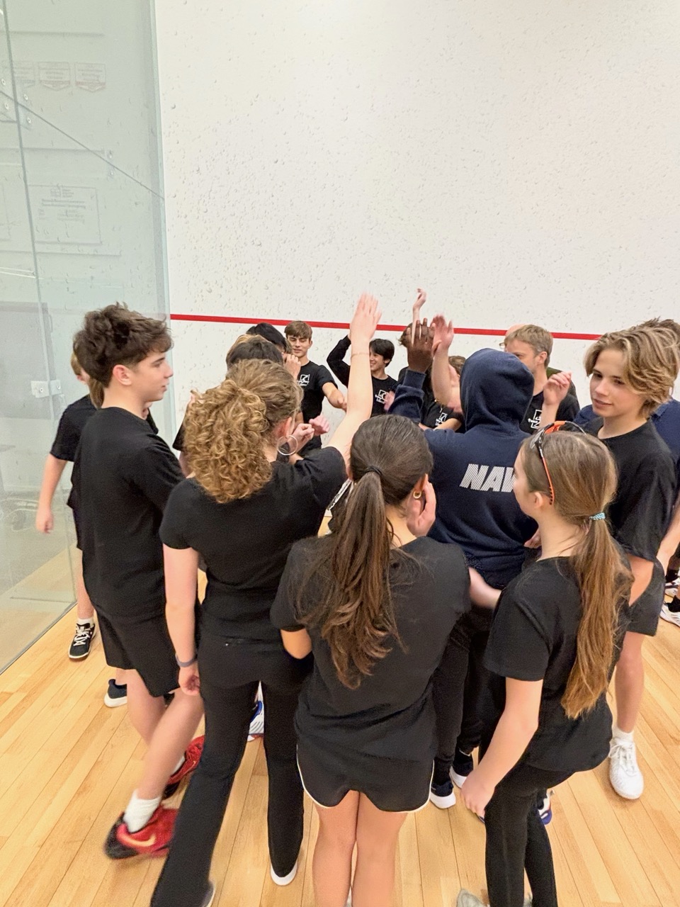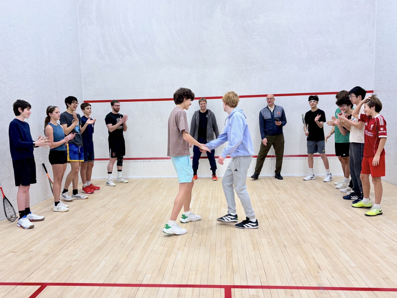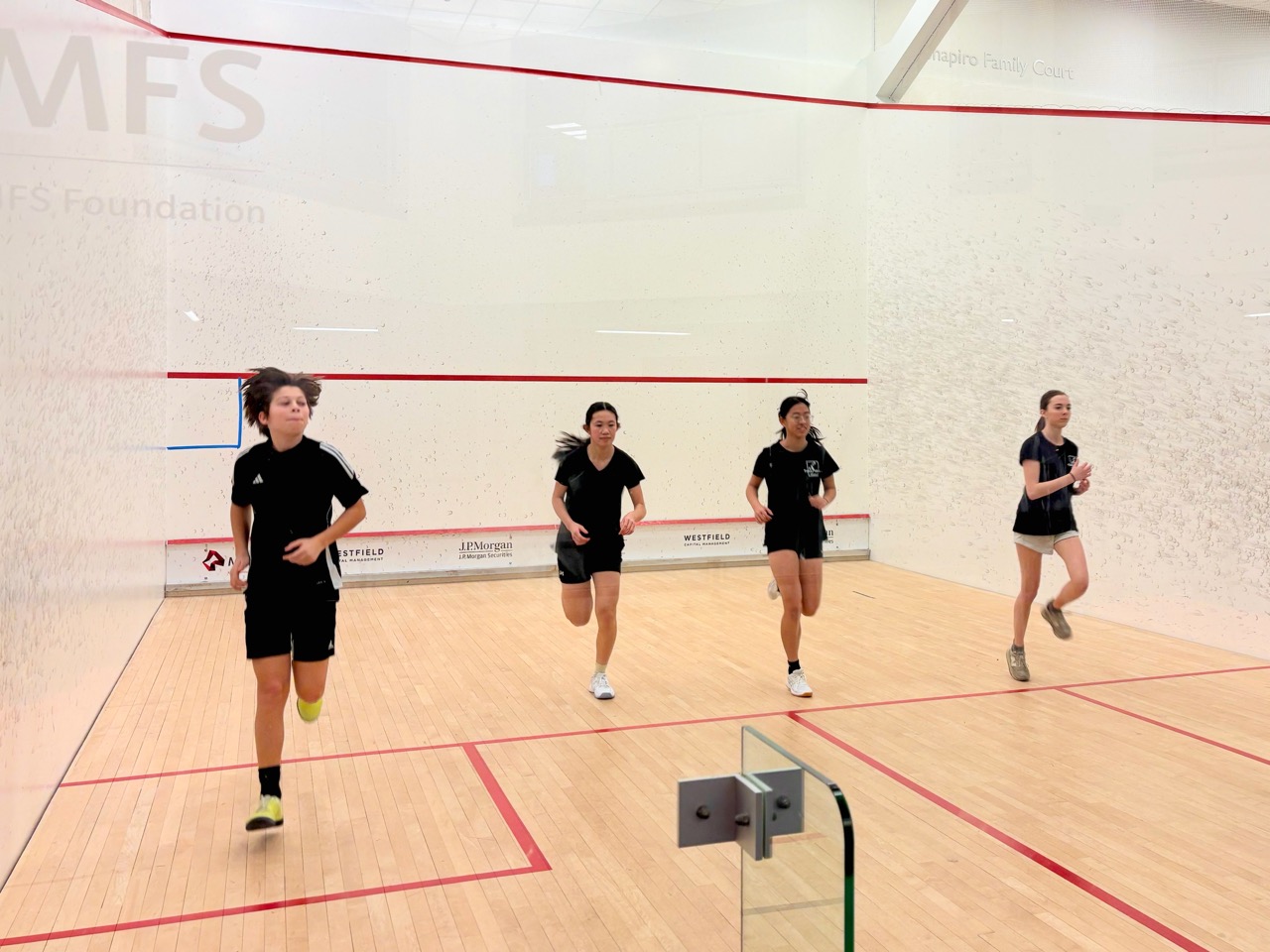 Players learned basic strokes and rules of the game. They started by playing games (to 11), and eventually matches (best of 5 games). They also learned how to referee and keep official scoresheets – extremely important as junior squash matches are all peer-reffed. This is one of the nicest parts of team and tournament play – after playing a match, the two competitors who just finished sit together to referee the next match on court – this forces competitors to acknowledge each other and to work together, helping to develop sportsmanship as well as friendships.