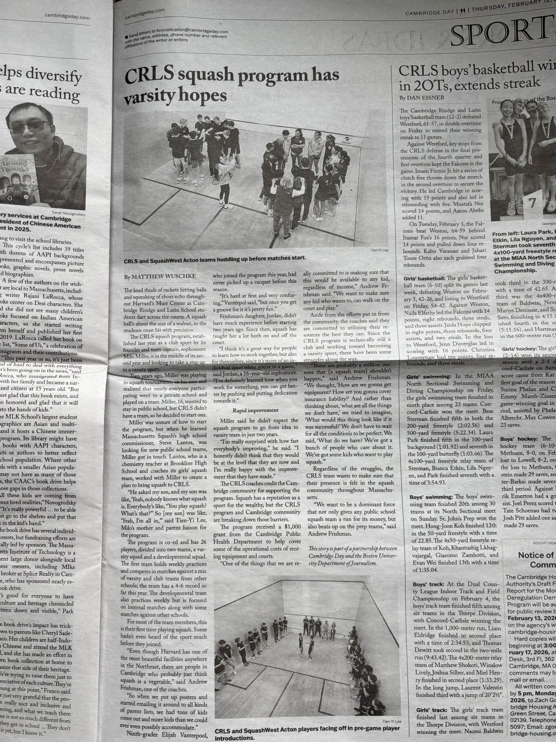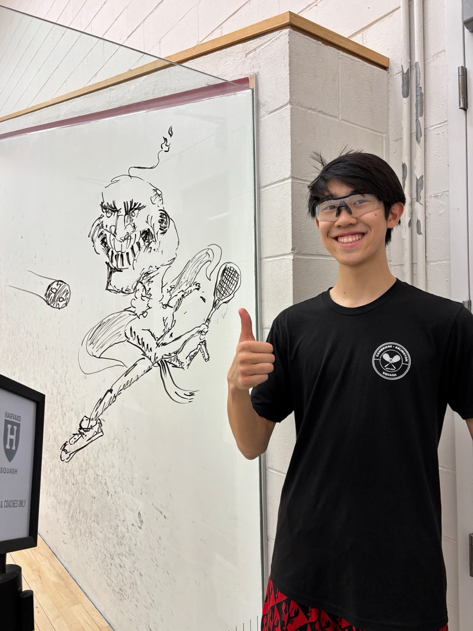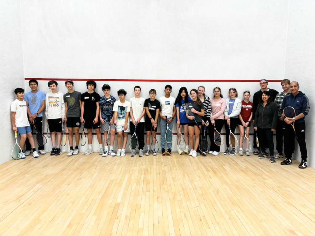 Milo Miller ’28 fell in love with squash at age 11 because, “the angles!” In September of his freshman year, he learned that MA Squash was trying to expand squash into more public schools – would he like to round up a few classmates to form a team at CRLS? His immediate response: “Let’s do it.” He wanted more kids to be able to try his favorite sport, or “at least know it’s not just a vegetable.” A week later, he had obtained the support of Harvard University’s varsity coaches, piqued the curiosity of several classmates, and convinced an Arlington squash friend’s parent/coach to help form a joint Cambridge-Arlington team. He started bringing kids to play at Harvard Murr and MIT, and discovered that once they got on court they were easily hooked—squash sold itself. Later came support from Naji Khan, local squash pro, as well as several enthusiastic CRLS parents and volunteers. So we ran with that!