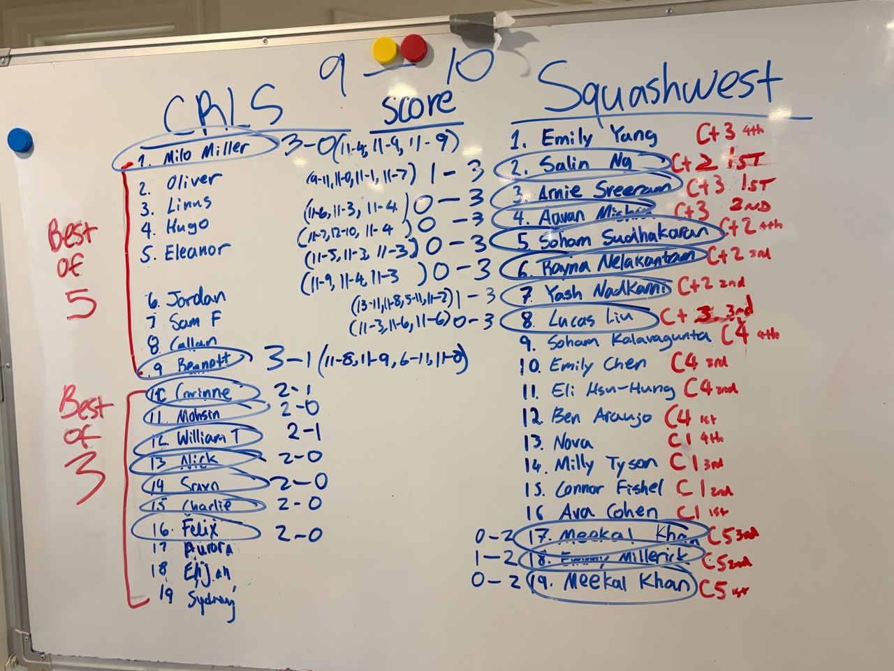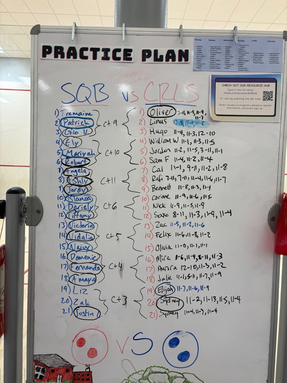 We continued to play challenge matches at our practices and several kids on our team now have squash ratings on Club Locker – an important milestone for any squash player! (To “get on the board” a player must win a match and lose a match against players who have ratings).