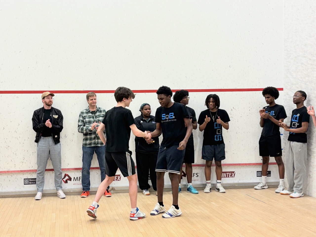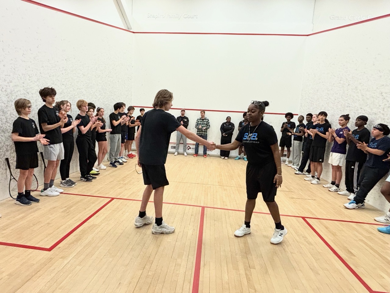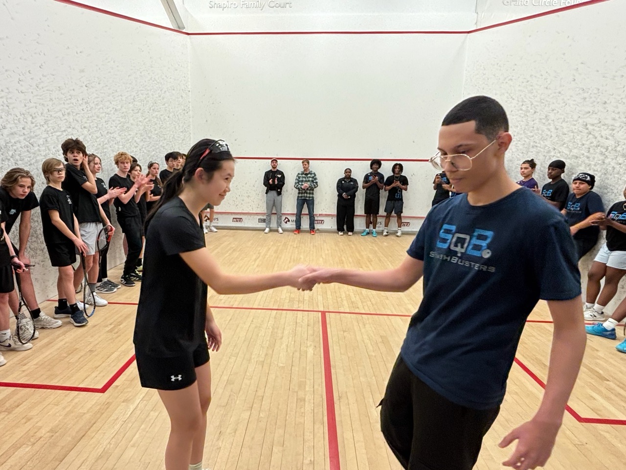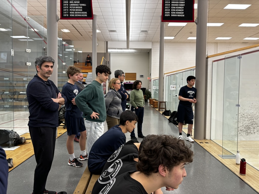 1/19: We brought a team of 8 players to the Boston Public Schools Tournament at SquashBusters’ Northeastern facility. We played three teams, SquashBusters Boston, SquashBusters Lawrence, and Wellesley. A lot of excitement in our final match, we were tied 3-3 with Wellesley, with our #1 seed left to determine the outcome – quite a crowd gathered to watch as he battled back from down 0-2 games to win 3-2 and our team was able to claim victory, 4-3. In addition to getting some solid playing experience, our beginners got to watch some pretty high-level squash too. Tons of fun and great energy all around!