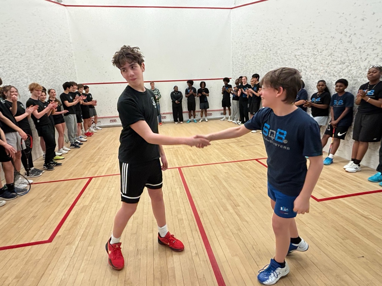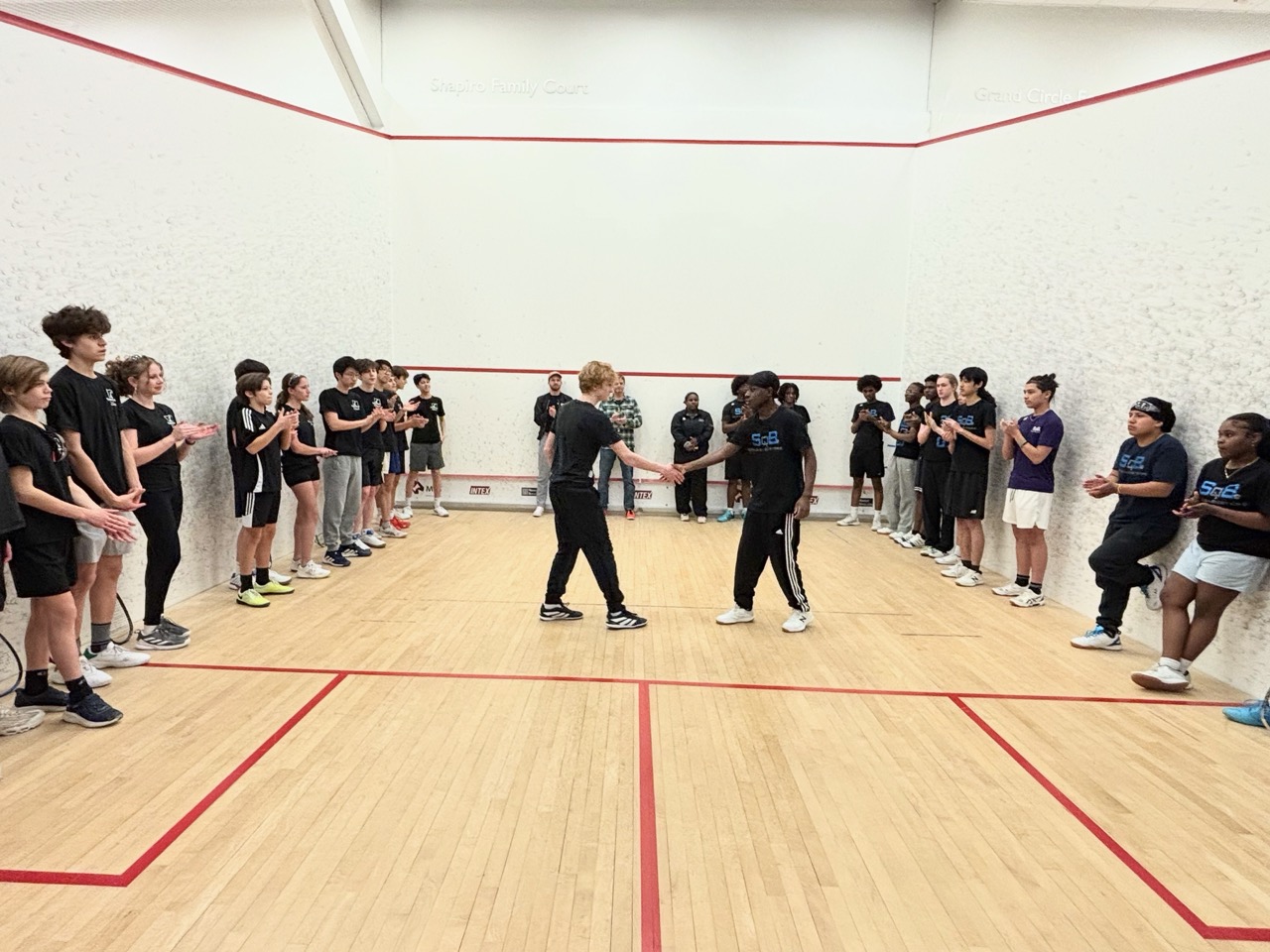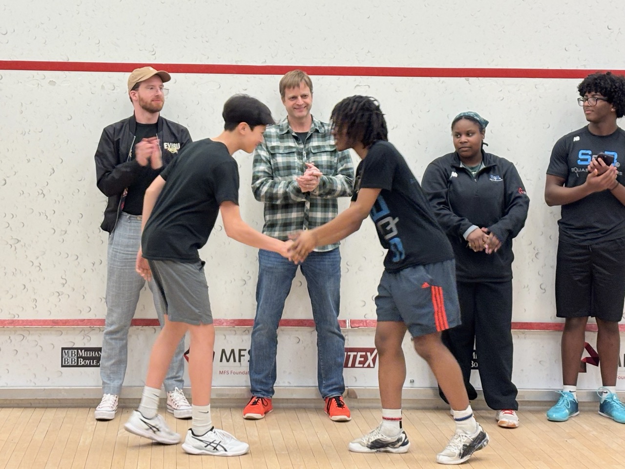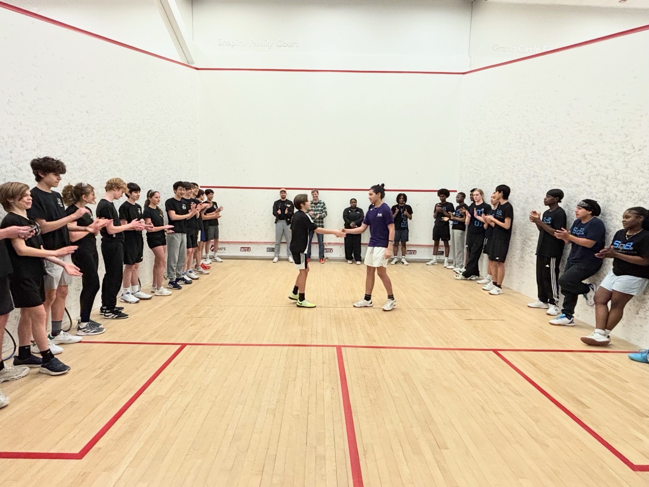 1/19: We brought a team of 8 players to the Boston Public Schools Tournament at SquashBusters’ Northeastern facility. We played three teams, SquashBusters Boston, SquashBusters Lawrence, and Wellesley. A lot of excitement in our final match, we were tied 3-3 with Wellesley, with our #1 seed left to determine the outcome – quite a crowd gathered to watch as he battled back from down 0-2 games to win 3-2 and our team was able to claim victory, 4-3. In addition to getting some solid playing experience, our beginners got to watch some pretty high-level squash too. Tons of fun and great energy all around!