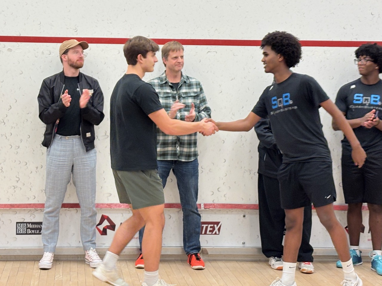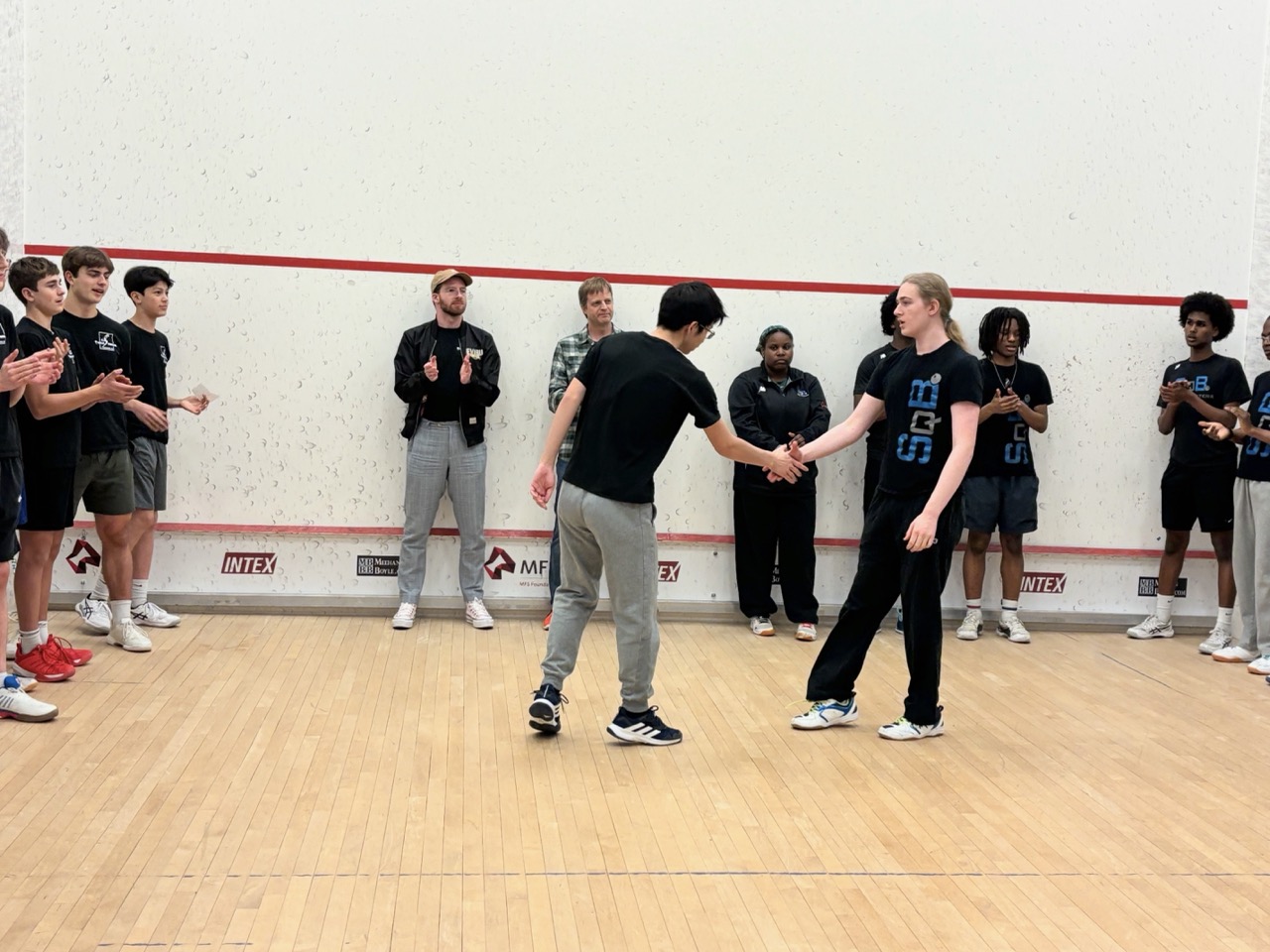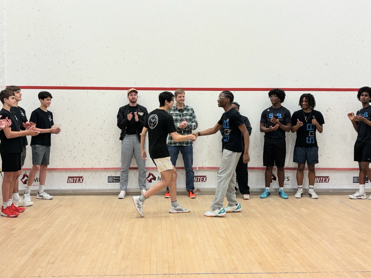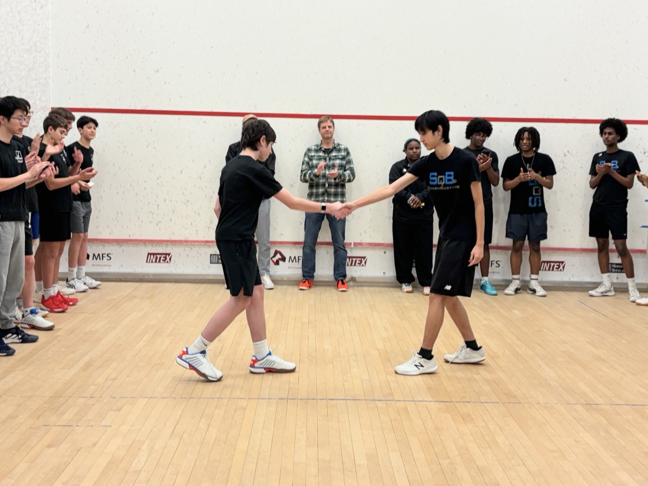 1/19: We brought a team of 8 players to the Boston Public Schools Tournament at SquashBusters’ Northeastern facility. We played three teams, SquashBusters Boston, SquashBusters Lawrence, and Wellesley. A lot of excitement in our final match, we were tied 3-3 with Wellesley, with our #1 seed left to determine the outcome – quite a crowd gathered to watch as he battled back from down 0-2 games to win 3-2 and our team was able to claim victory, 4-3. In addition to getting some solid playing experience, our beginners got to watch some pretty high-level squash too. Tons of fun and great energy all around!